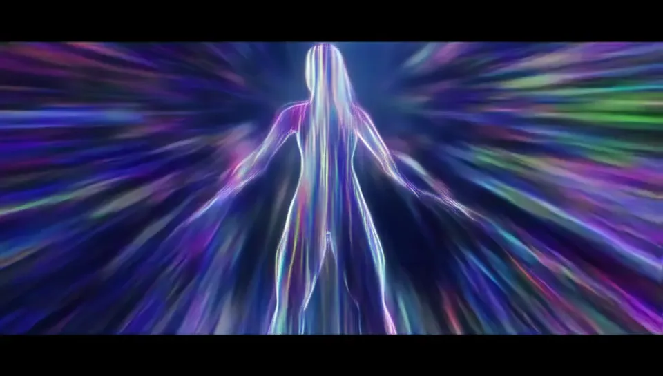 8k resolution, ultra-realistic 3D animation depicting quantum WiFi signals entering and exiting a human body. Show the signals as shimmering, multicolored energy streams, interacting with the body's cells and systems. Focus on visualizing the transfer of data, not biological detail.